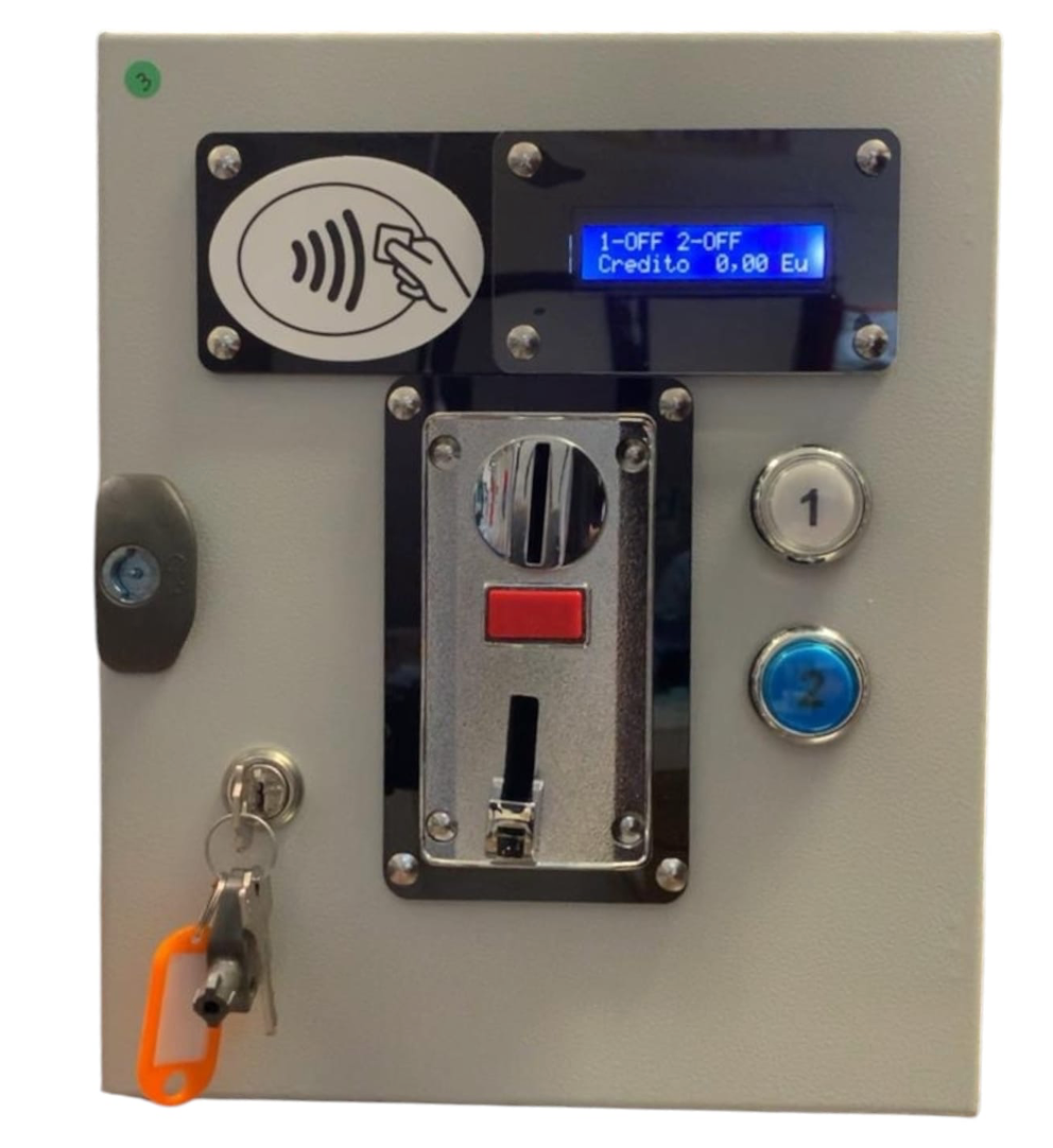 Gettoniera elettronica professionale progettata per gestire 2 lavatrici industriali o professionali tramite pagamento con monete e tessere/braccialetti RFID ricaricabili. Ideale per lavanderie self-service, campeggi, residence, palestre e strutture ricettive.