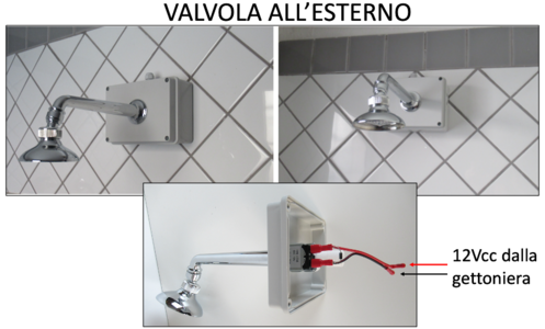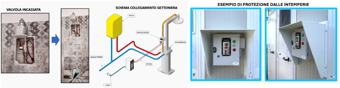 Nota: Per l'installazione delle gettoniere su impianti docce esistenti, è possibile montare le elettrovalvole esternamente, posizionandole prima del soffione e inserendole in una scatola stagna, come illustrato negli esempi qui sotto. Si ricorda che non forniamo assistenza tecnica per prodotti installati senza seguire le istruzioni allegate.