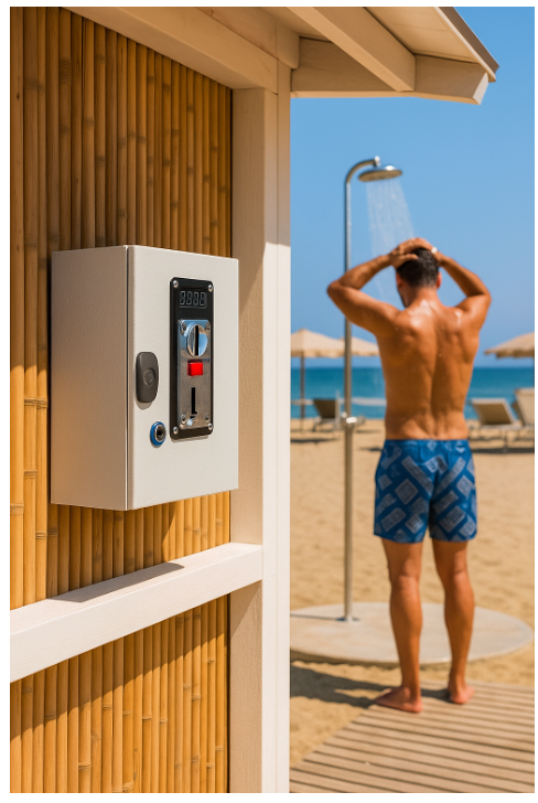 Gettoniera per doccia a tempo con comando elettrovalvola 12Vcc, ideale per stabilimenti balneari, campeggi, spiagge attrezzate, aree pubbliche e cantieri. Permette di offrire docce a pagamento con gestione precisa di tempo e consumi.