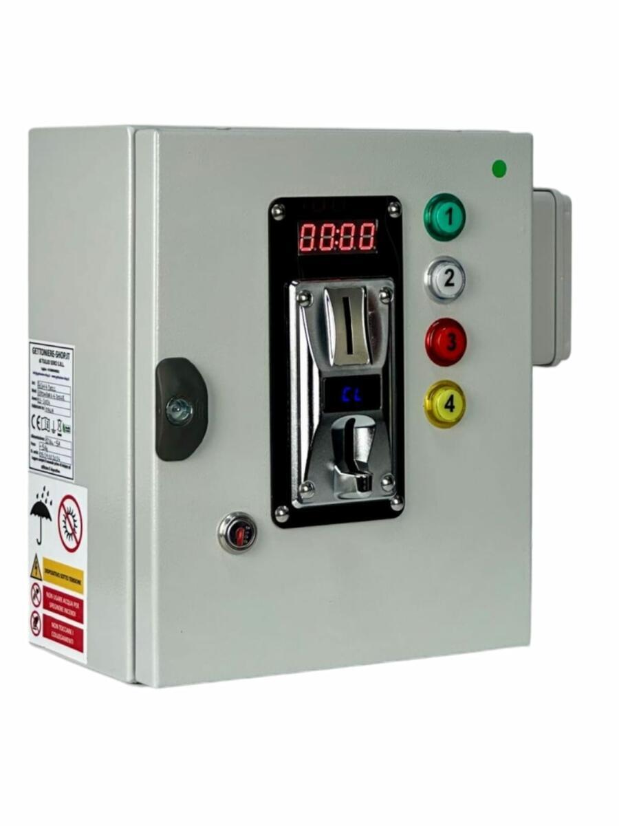 Questa gettoniera multimoneta per 4 porte è una soluzione professionale per gestire l’apertura controllata di più accessi tramite pagamento a monete o, su richiesta, tramite gettone dedicato.